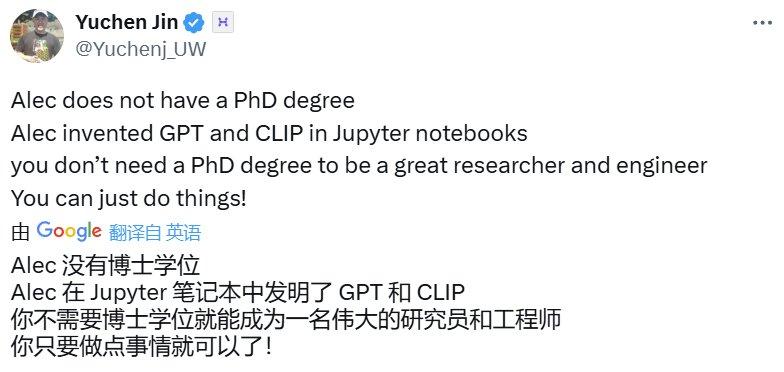 事实上,早在一年多以前,就已经有人指出了这位当时还声名不显的研究者的巨大贡献:他是 GPT 原始论文等多篇奠基性研究成果的第一作者!而更让人惊讶的是, 他并没有博士学位,也没有硕士学位 ;并且他的许多研究成果最早都是在 Jupyter Notebook 中完成的。