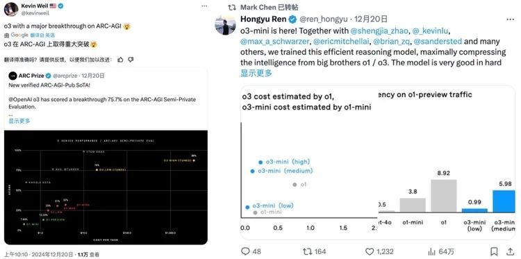 首席产品官Kevin Weil和研究副总裁Mark Chen分别转发ARC-AGI测试突破和o3-mini团队的推文。