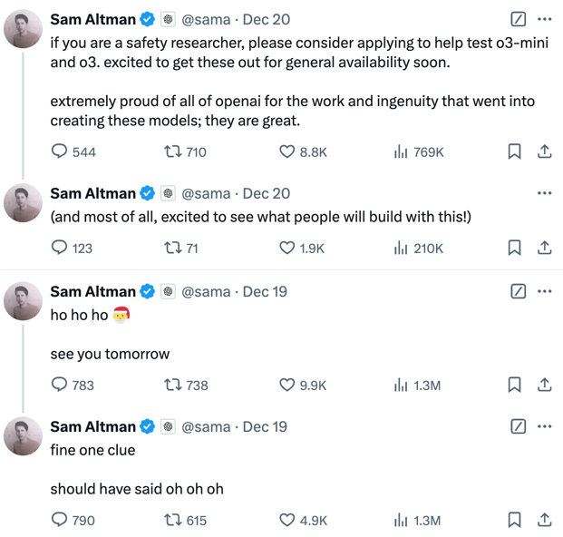 掌门人奥特曼不用多说了:从发布前按捺不住以“oh oh oh”暗示新品,邀请大家申请o3测试权限;