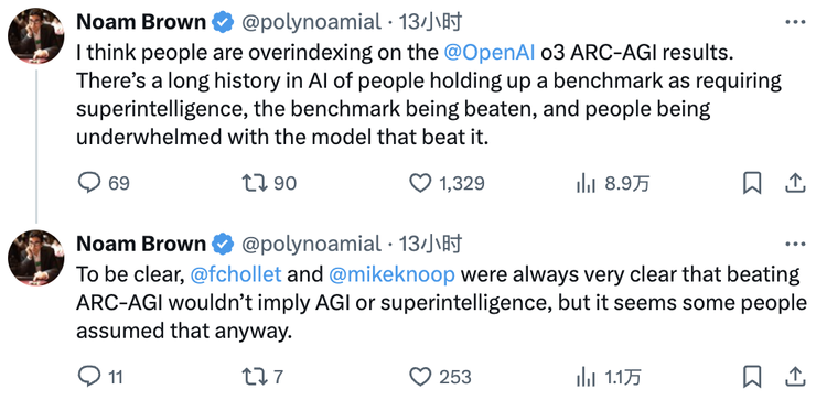 对此,OpenAI多模态推理研究员Noam Brown发文表示:外界对ARC-AGI测试的反应有些过度,突破ARC-AGI基准并不意味着模型已达到AGI水平。他还提到了AI领域的一个普遍现象:人们往往认为某个基准测试需要"超智能"才能完成,但当真的有模型攻克这个基准时,人们又会因为它没有达到预期中的"超智能"水平而感到失望。