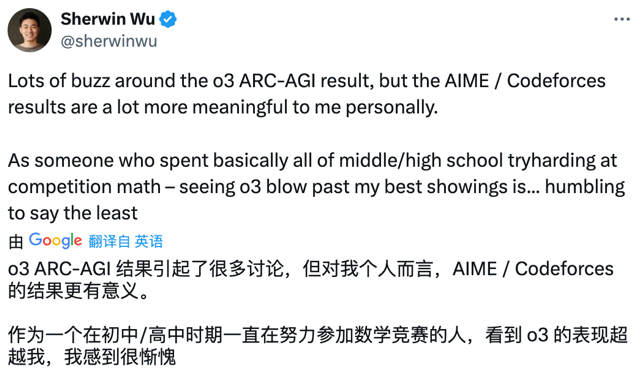 OpenAI API工程主管Sherwin Wu对此深表赞同,Sherwin提醒社区:比起ARC-AGI测试,o3在编程和数学上的突破才更值得关注——o3的编程水平已经超越了自己,而o3能答对四分之一的前沿数学题目自己更是一道都解不出。