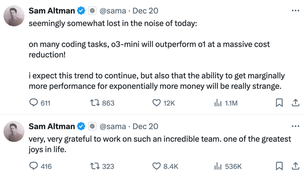 到强调o3-mini编程表现以显著降低的成本超越o1,在线感激团队成员的辛劳付出,称大家一起工作是“人生中最大的快乐之一”;
