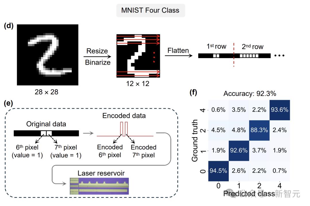 在MNIST手写数据集任务中,研究人员又评估了激光储库的分类性能。MNIST数据集包含由28×28灰度像素组成的手写数字图像。
