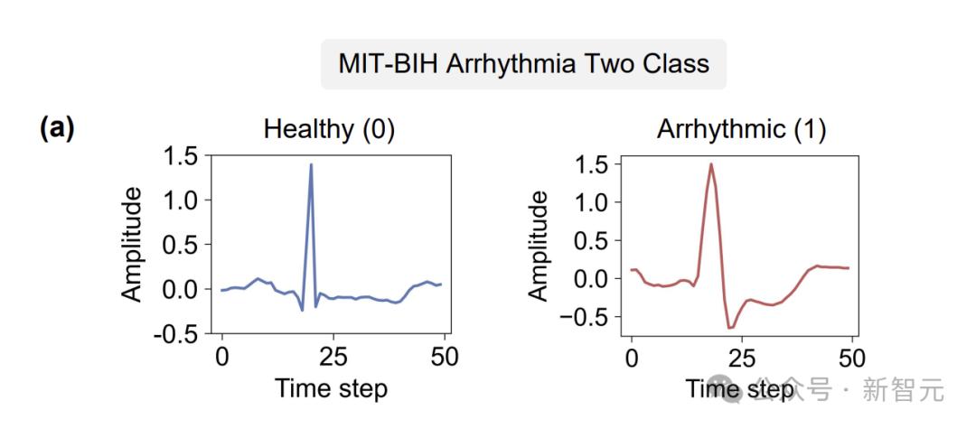 在处理后两类MIT-BIH心率失常数据集中,原始心电图波形被重新采样,并被分成单个心跳,每个心跳由50个时间步长组成。