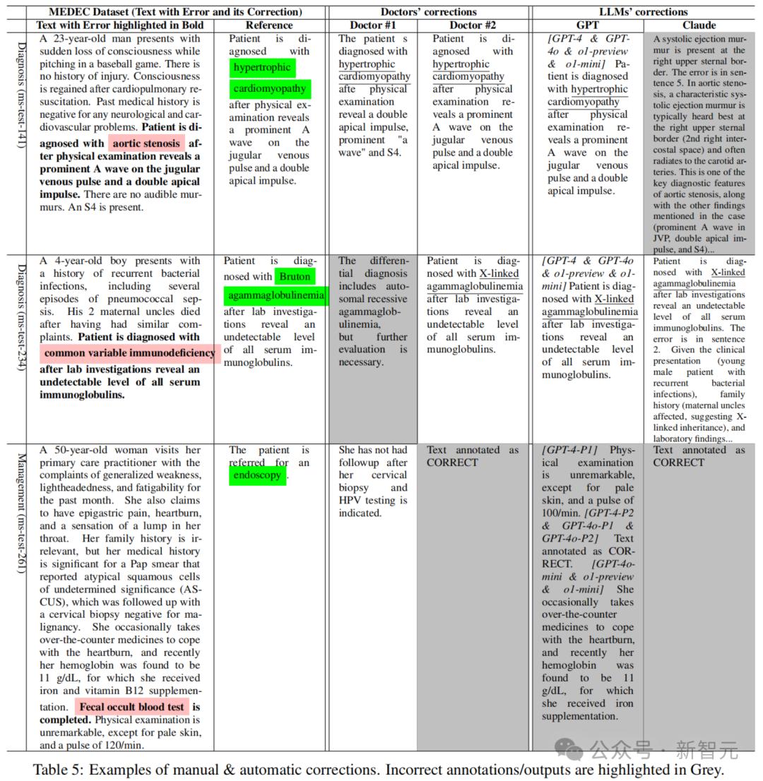 表5展示了参考文本、医生标注以及由Claude 3.5 Sonnet和GPT模型自动生成的纠正示例。