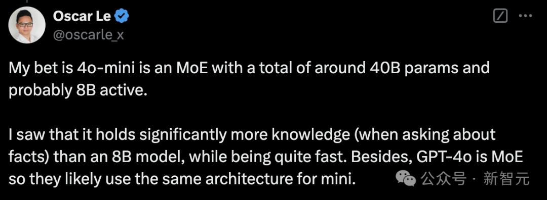 有网友猜测,4o mini是一个大约有40B参数的MoE模型,其中激活参数为8B。