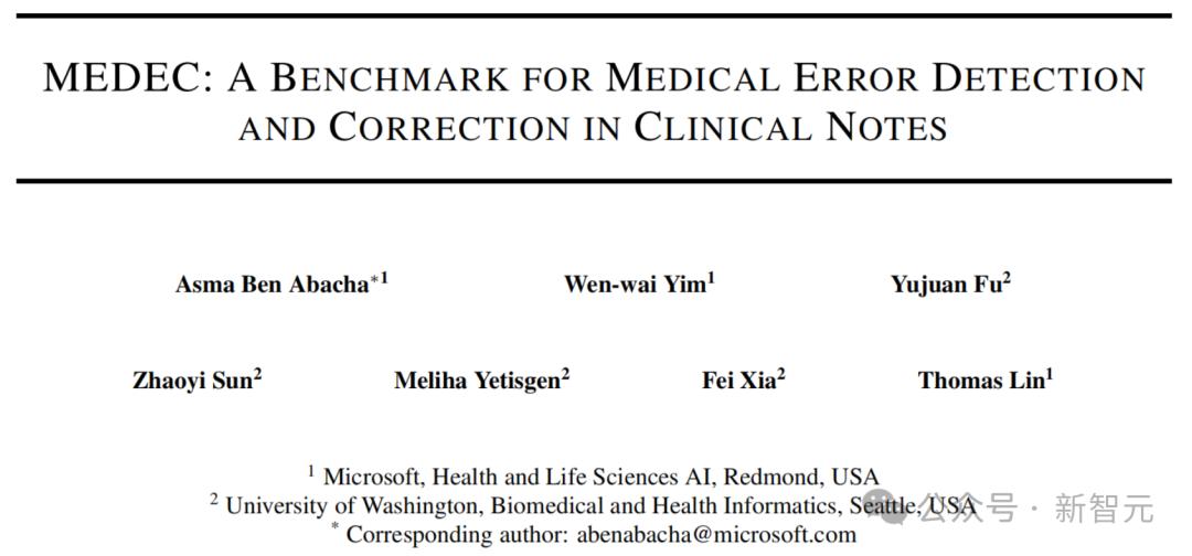 这篇来自微软、华盛顿大学团队的论文中,发布了一个具有里程碑意义的评估基准——MEDEC1,专为临床笔记医疗错误检测和纠正而设计。