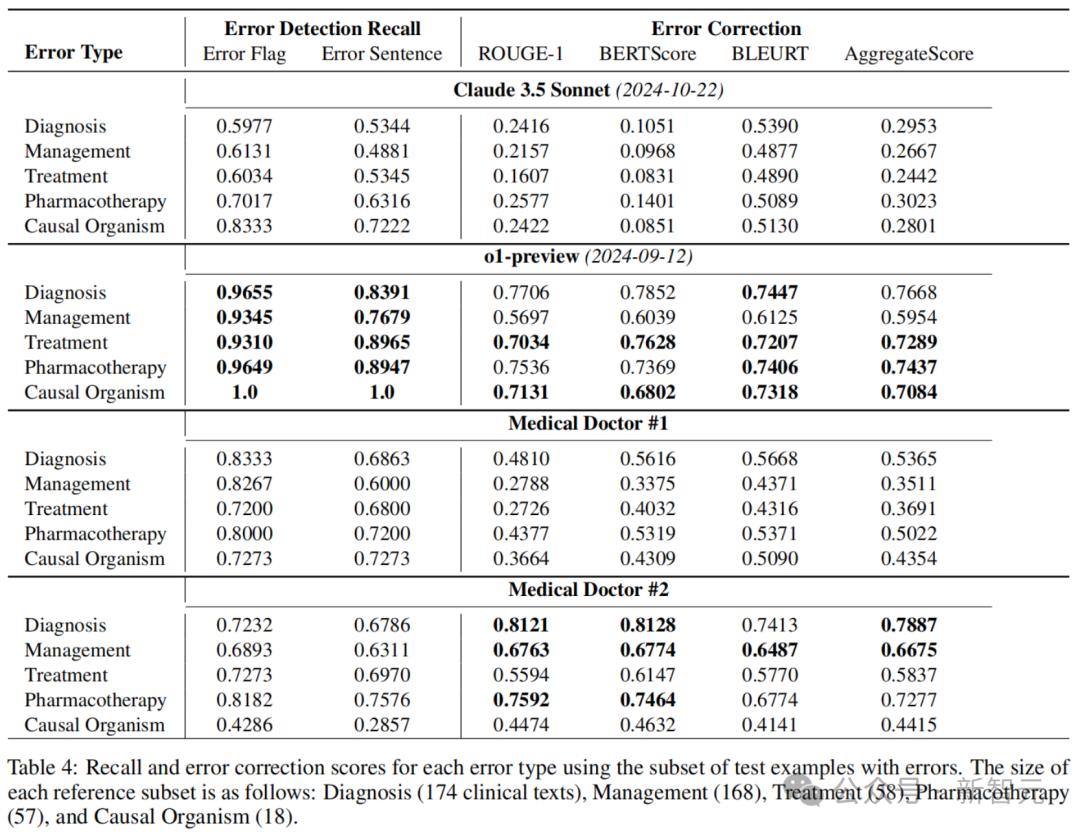 下表4展示的则是,每种错误类型(诊断、管理、治疗、药物治疗和病因微生物)的错误检测召回率和错误纠正评分。