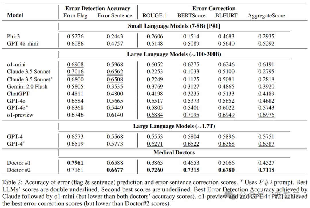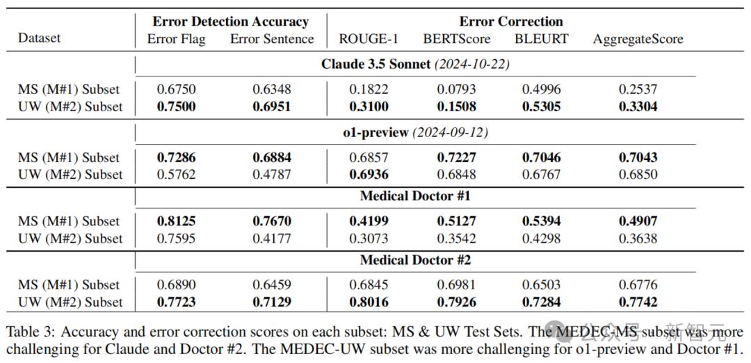 下表3展示了,在每个数据集(MEDEC-MS和MEDEC-UW)上的错误检测准确率和错误纠正评分。其中,MS子集对Claude 3.5 Sonnet和医生#2来说更具挑战性,而UW子集对o1-preview和医生#1来说更具挑战性。