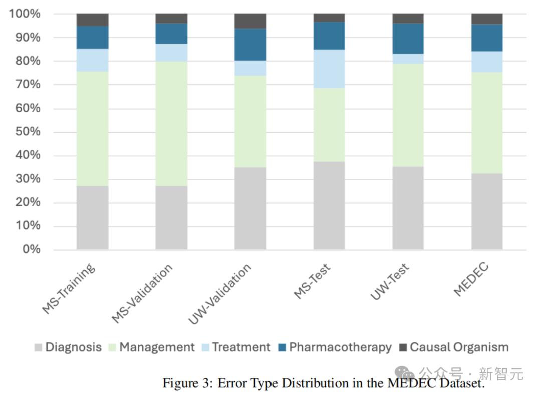 下图3展示了数据集中错误类型的分布情况(诊断、管理、治疗、药物治疗和致病因子)。