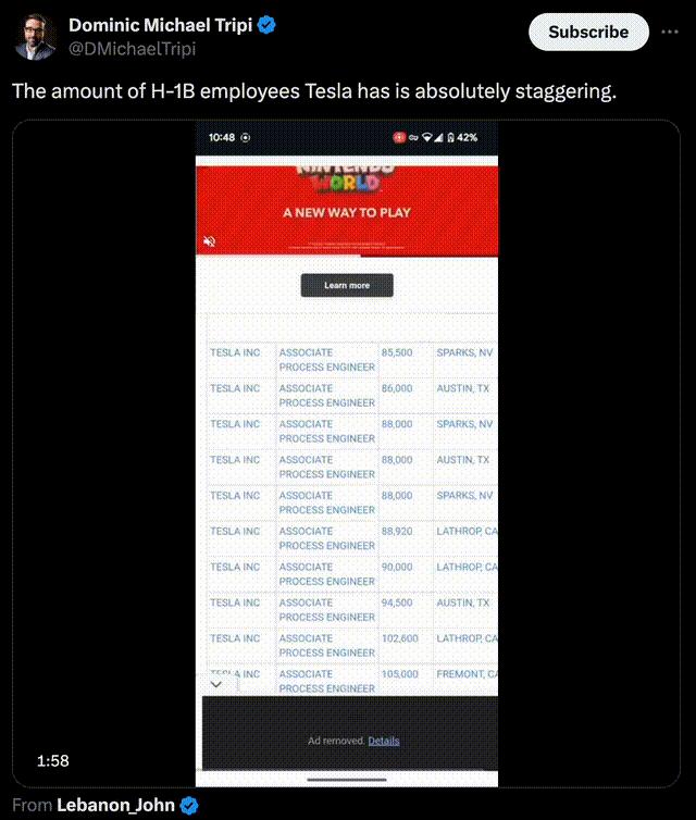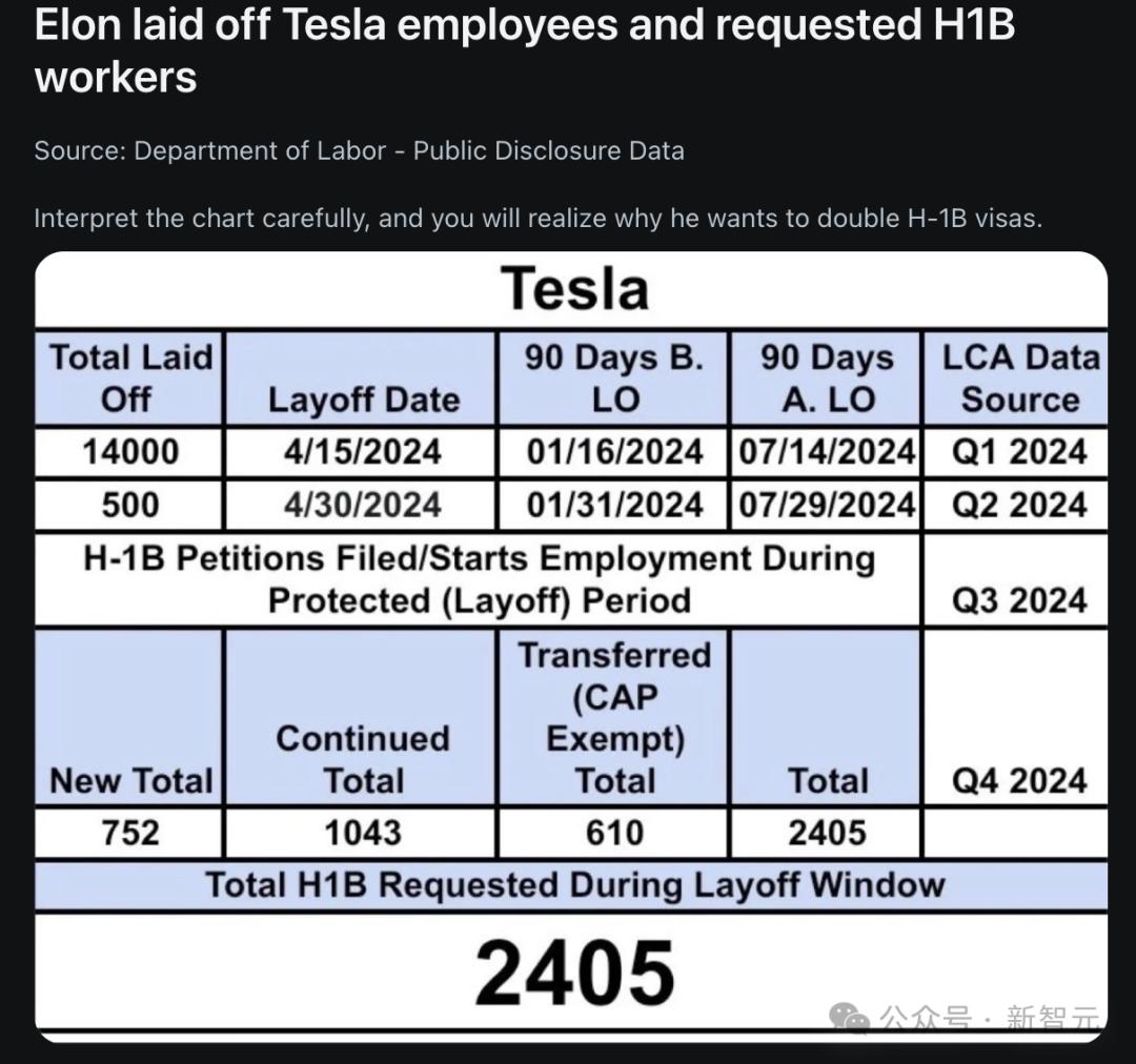 来自美国劳工部的数据证实了这点:特斯在解雇美国工人期间,申请了2000多份H-1B签证。