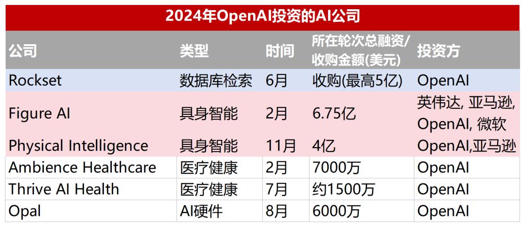 2024年,OpenAI投资了6家公司,其中包括2家具身智能、2家医疗健康、1家AI硬件和1家数据库检索。