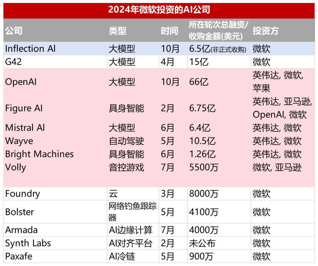 2024年,微软参与了12家AI公司的融资项目,其中包含3家大模型公司,分别是OpenAI、Mistral AI、G42。