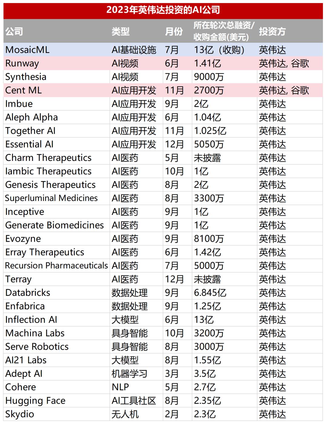 2024年,英伟达在大模型领域出手了6次,分别是OpenAI、xAI、Anthropic、Mistral Al、Cohere、Fireworks AI、Sakana AI。