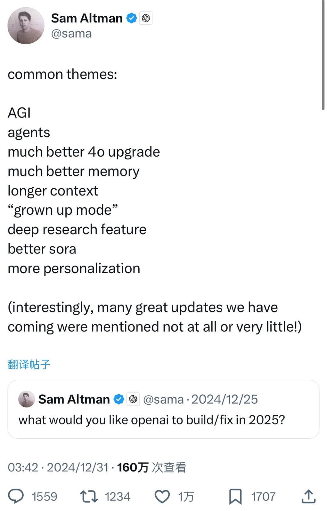新的一年,成为一家营利性公司的OpenAI,在找到一个更好的公司治理结构和方式后,也早就公布了自己2025年的九大目标:AGI、Agents、变得更好的4o、更好的记忆力、更长上下文、“成熟模式”(“grown up mode”)、深入研究功能、更好的sora和更多个性化设置。