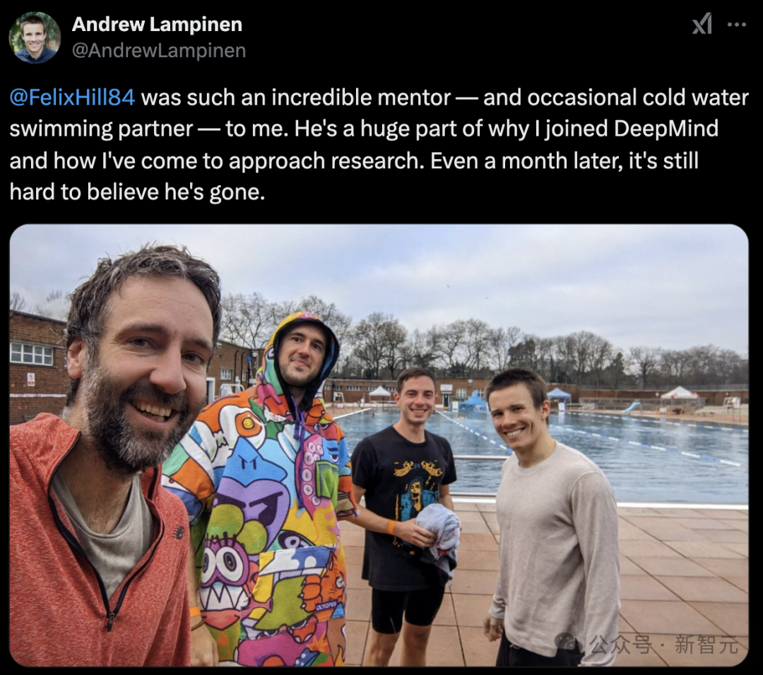 Felix Hill 是一位非常出色的导师 —— 偶尔也是我的冬泳伙伴。我能加入 DeepMind,以及形成如今做研究的方式,很大程度上都要归功于他。都过去一个月了,我还是觉得难以相信他已经离开了。