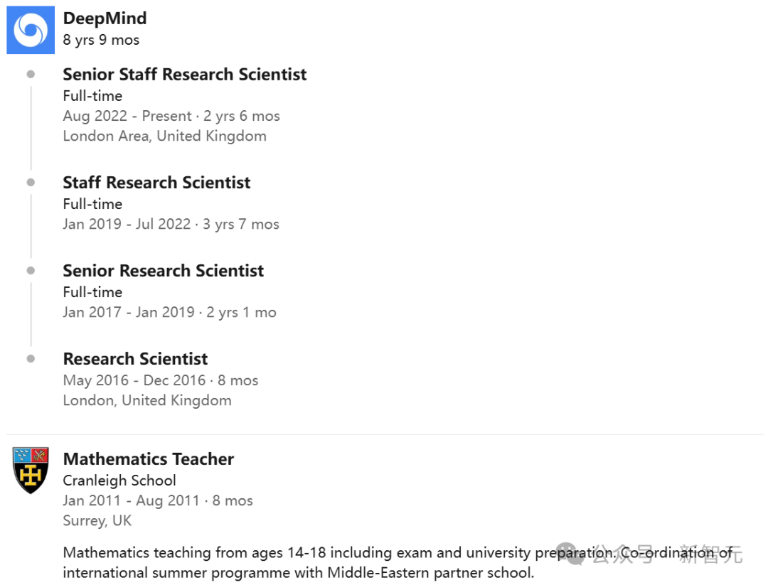 毕业后,他曾有 8 个月在高中担任数学老师,随后进入谷歌 DeepMind,当了将近 8 年的 AI 研究者。
