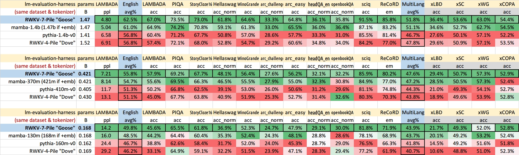 最新发布的RWKV-7模型,在同等参数规模下,可以全面超越Transformer架构的性能。这种优势体现在多个维度:例如,在模型学习效率上,RWKV-7能比经过充分优化的Transformer架构更快地提升准确度。而使用相同参数和训练数据的情况下,在核心benchmark如英语和多语言测试中,RWKV-7也能表现更优。