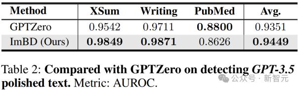 仅使用1000个样本和5分钟的SPO训练,ImBD就达到0.9449的AUROC分数,超过了使用大规模数据训练的商业检测工具GPTZero [4] (0.9351)。