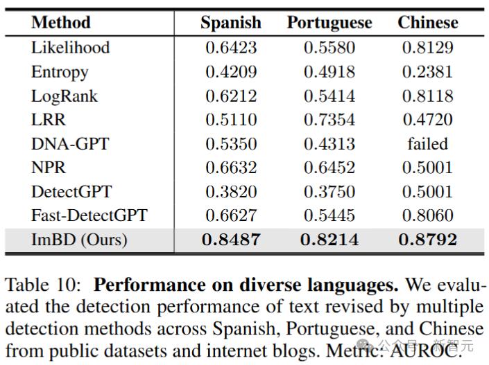 ImBD在多语言文本检测中展示出优异的泛化能力,在西班牙语、葡萄牙语和中文的检测中分别达到0.8487、0.8214和0.8792的AUROC分数,全面超越Fast-DetectGPT等基线方法,且在部分基线方法(如DNA-GPT [9] )失效的中文测试中仍保持稳定性能。