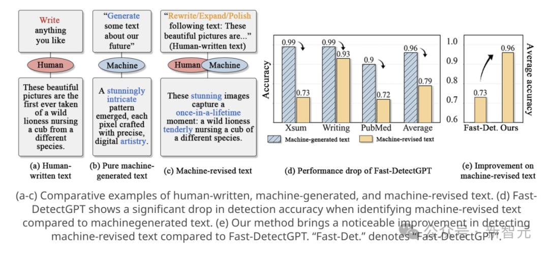 如图1(d)所示,在检测机器修订文本时,即使是最先进的Fast-DetectGPT [1]方法也出现了明显的性能下降。