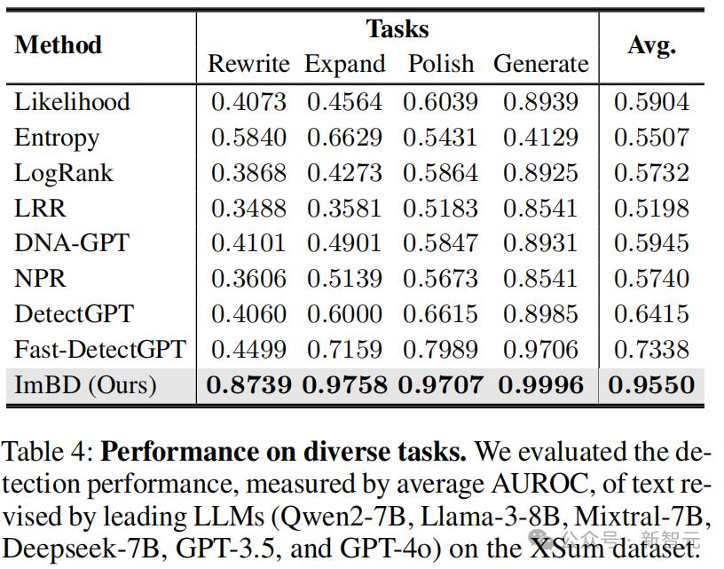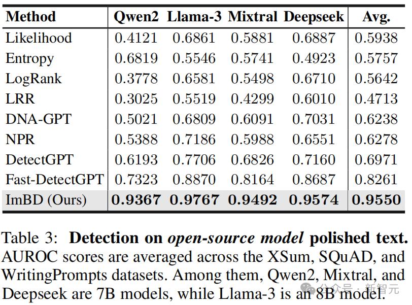 在检测Qwen2-7B [5] 、Llama-3 [6] 、Mixtral-7B [7] 和Deepseek-7B [8] 四个开源模型修改的文本时,ImBD方法在XSum、SQuAD和WritingPrompts三个数据集上的平均AUROC达到0.9550,显著优于Fast-DetectGPT的0.8261。