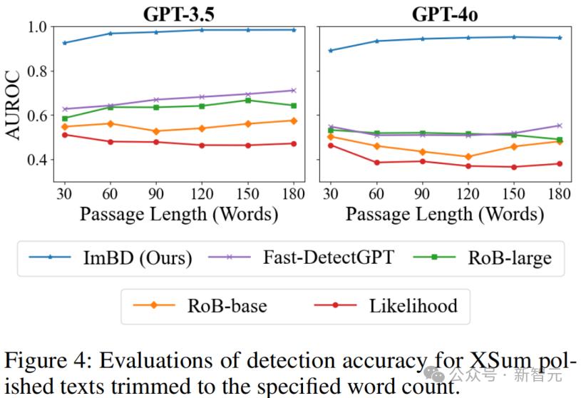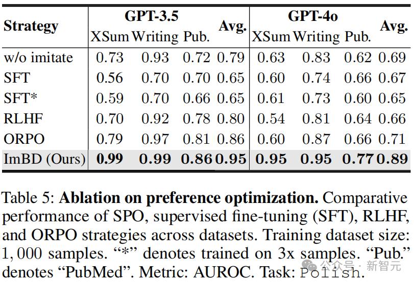 与未使用模仿策略的基线模型相比,采用SPO优化的ImBD方法在GPT-3.5和GPT-4o的文本检测上AUROC分别提升了16%和20%;相比使用3倍训练数据的SFT(Supervised Fine-Tuning)方法,ImBD的AUROC在GPT-3.5和GPT-4o上分别高出30%和24%。