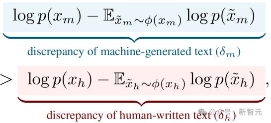 下的期望值来估计;右端则表示人类写作文本的对数概率及其对应的扰动期望值。这个不等式反映了机器生成文本在扰动后往往出现更显著的概率下降,而人类写作文本则保持相对稳定的概率分布特征。
