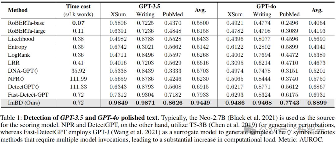 在polish任务上,相比Fast-DetectGPT,ImBD在检测GPT-3.5 [2] 和GPT-4o [3] 修订的文本时分别提升了15.16%和19.68%的性能;相比有监督模型RoBERTa-large,ImBD在GPT-3.5和GPT-4o的文本检测上分别提高了32.91%和47.06%的性能。在保持高检测性能的同时,推理速度仍保持高效,每1000词仅需0.72秒。