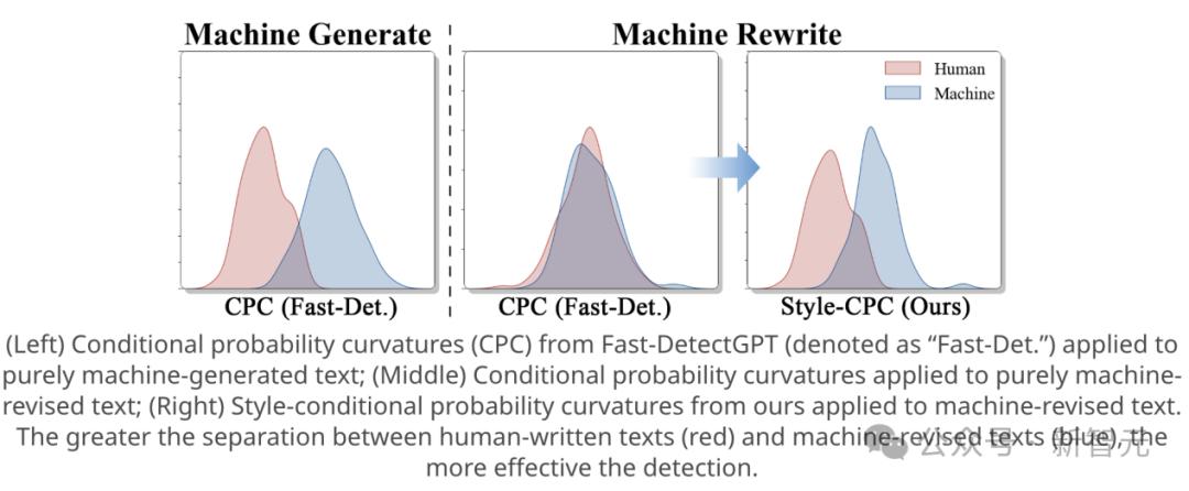 通过这种度量,能够有效量化文本样本与机器风格的偏离程度。如图2对比所示,优化后的模型能够显著减少人类文本和机器修改文本分布的重叠,最终通过简单的阈值策略实现准确检测: