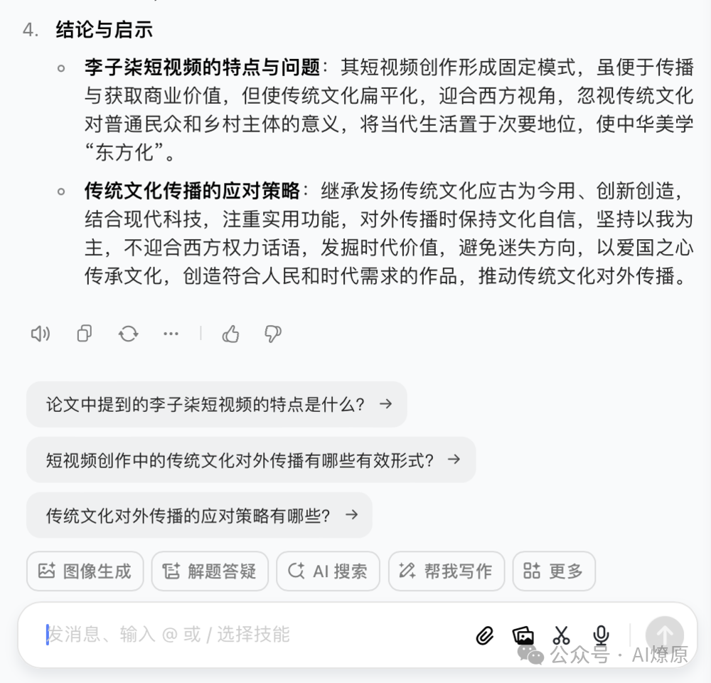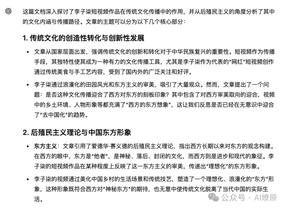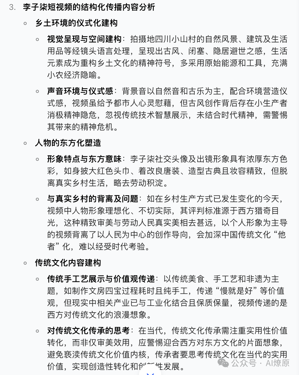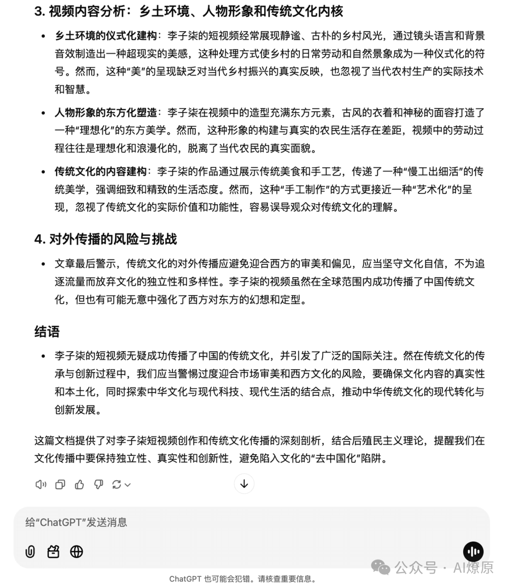 可以看到,ChatGPT并不按常理出牌,它像kimi一样有头有尾,呈现出带有“主体性”风格的叙述语言,在论文的第3部分,非常聪明地把论文框架里“结构化的内容传播”解读为通俗性的“视频内容分析”,对框架进行了“解读”。第4部分的“对外传播的风险与挑战”也是智能解读出来、并非原文框架的内容。