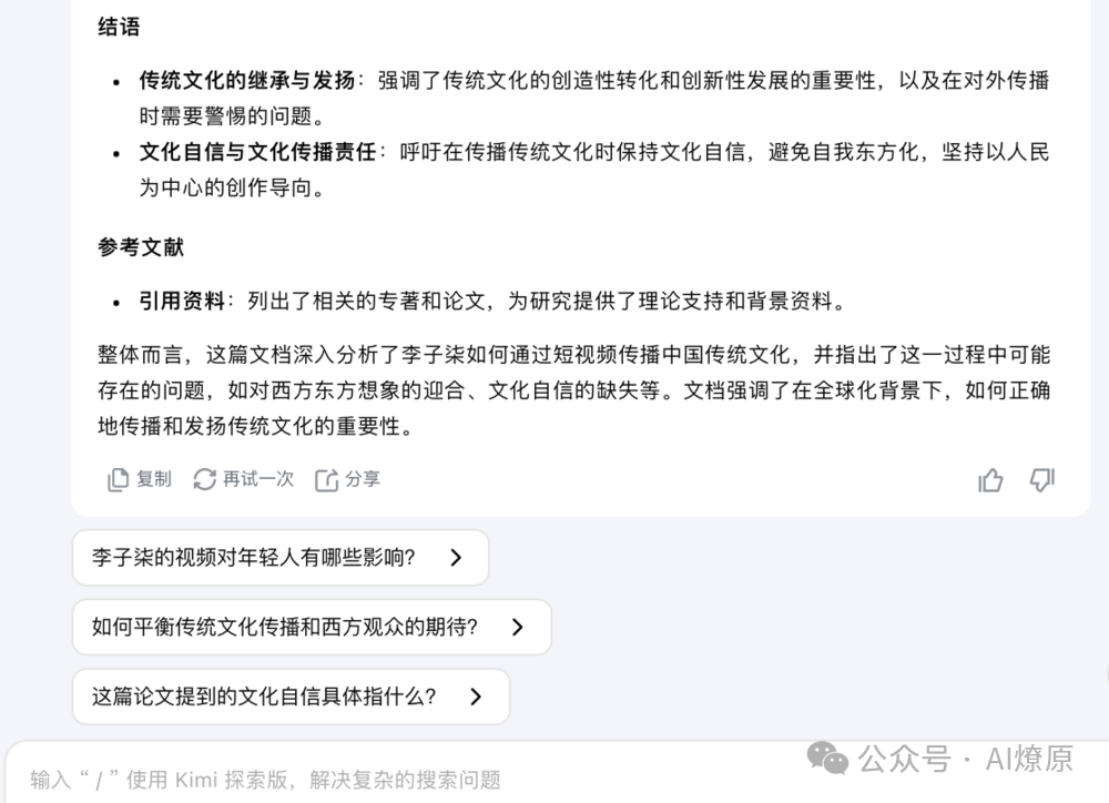 Kimi在处理《短视频创作中的传统文化对外传播——以李子柒为例》这篇论文时,能够快速解析文档并给出总结,内容简洁,有头有尾,能够抓住文档的核心要点。