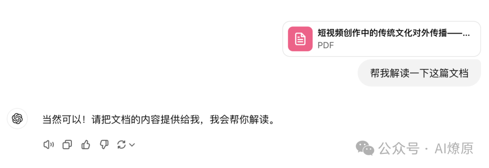 ChatGPT似乎不支持pdf格式的文件,我上传后显示让我直接提供文档内容。换成word格式也是如此。