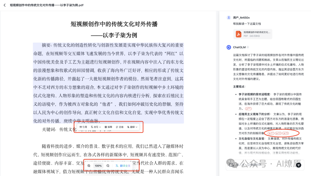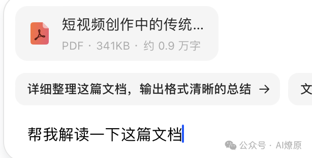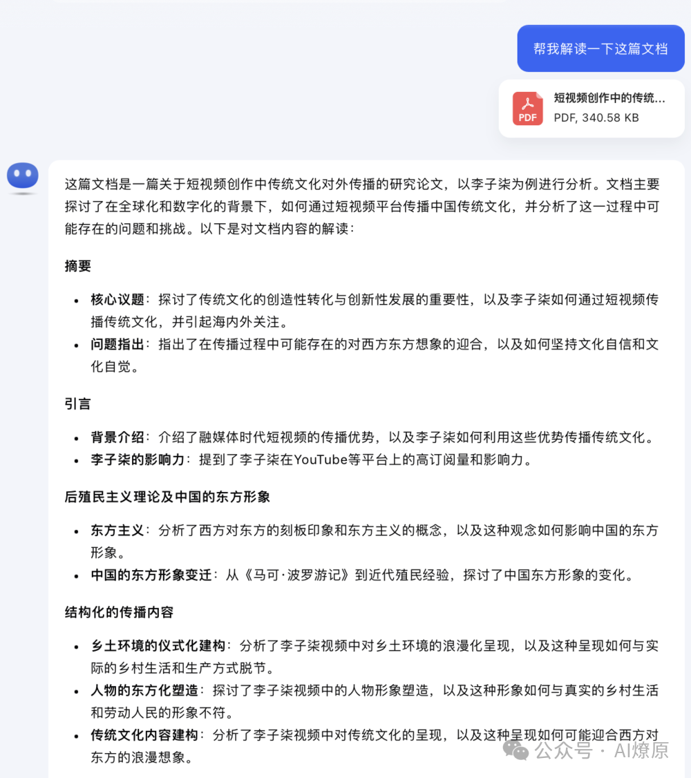 具体的操作是,上传一篇pdf格式的论文附件,输入prompt:帮我解读一下这篇文档。