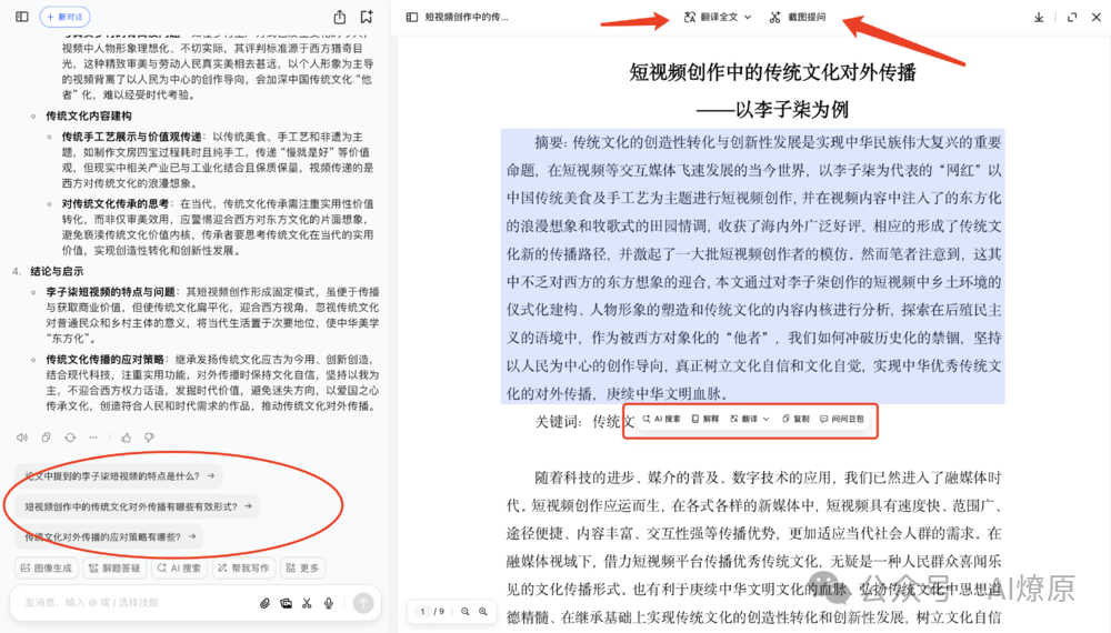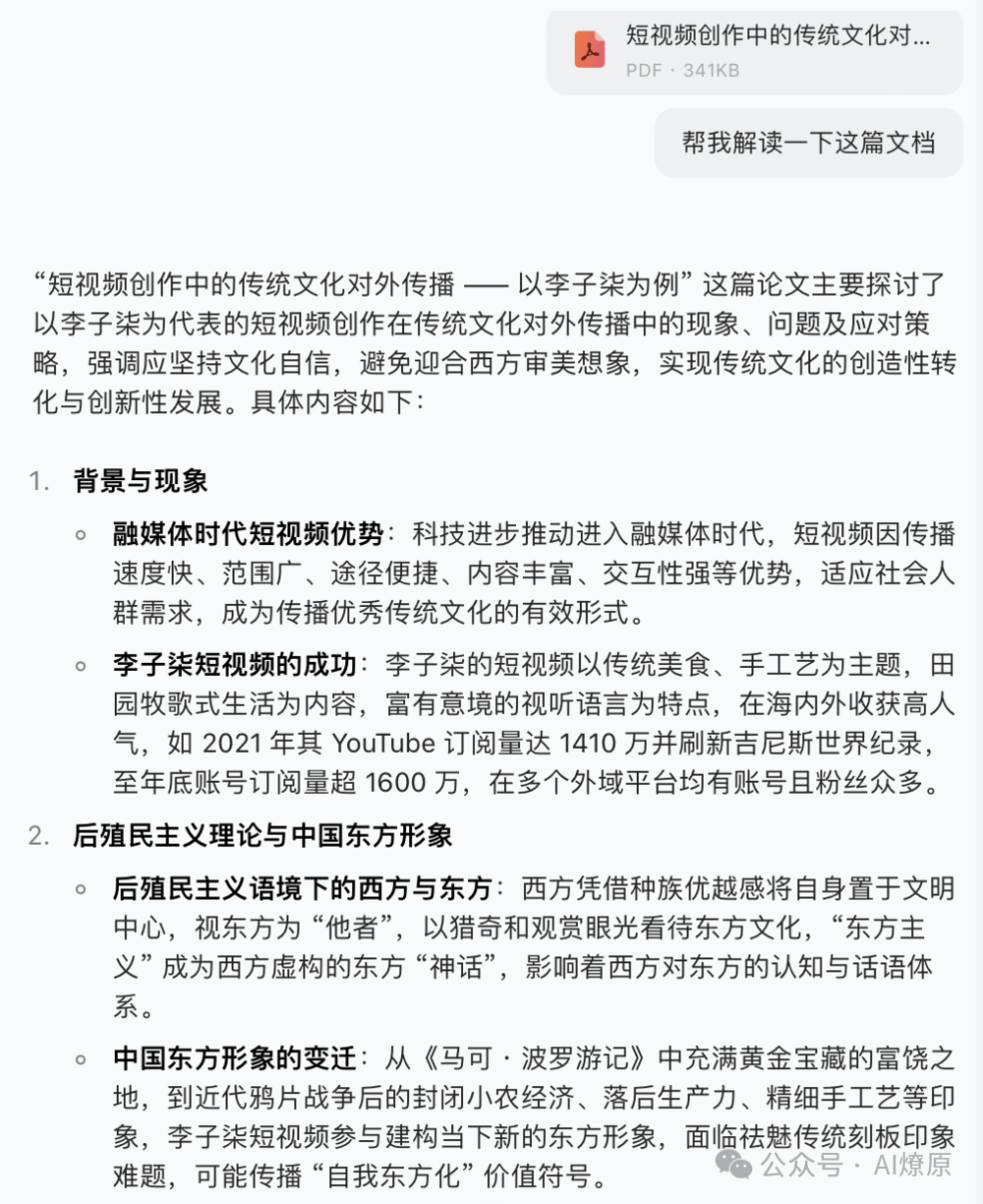 首先是Kimi,文档附件是题为《短视频创作中的传统文化对外传播——以李子柒为例》的论文,字数约6000。输入“帮我解读一下这篇文档”。