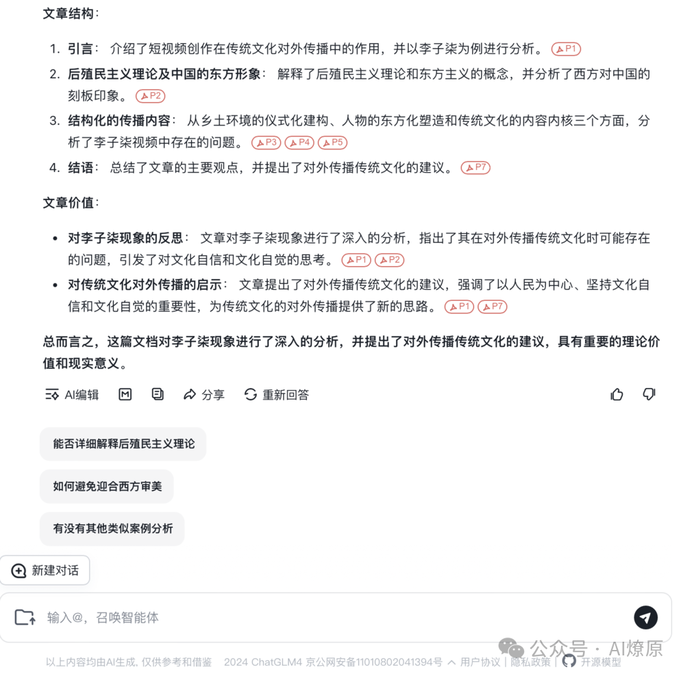 智谱清言的总结有头有尾,核心内容包括主要观点、文章结构、文章价值几个部分。总体而言,智谱清言更加像一篇“解读”,而不是文章内容的照搬照抄。