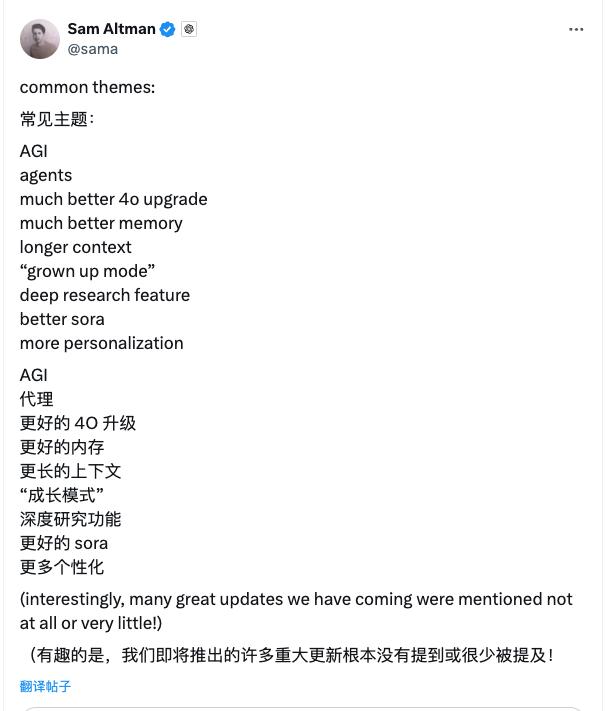 而「年轻辈」的科技新贵,面对的情况不尽相同。比如 Sam Altman 在 2024 年圣诞节时,公开向网友征集想要 OpenAI 在 2025 年实现什么。在 12 月 31 日他公布了一系列关键词: