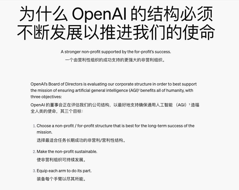 「投资者想要支持我们,但当资本达到一定规模时,我们需要采用传统的股权结构,减少定制化的公司结构。」在最新的官方博文中,OpenAI 这样表示。