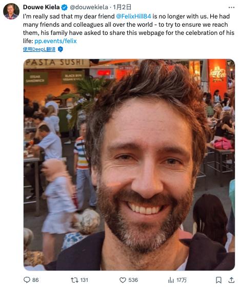 Douwe Kiela 表示,「我亲爱的朋友 @FelixHill84 去世了,我真的很难过。他在世界各地有很多朋友和同事——为了确保我们能联系到他们,他的家人要求分享这个网页,以纪念他的一生:https://pp.events/felix。」