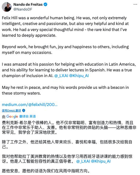 令 AI 界悲痛不已,噩耗而至。Felix Hill 的英年早逝是人工智能研究领域的重大损失。