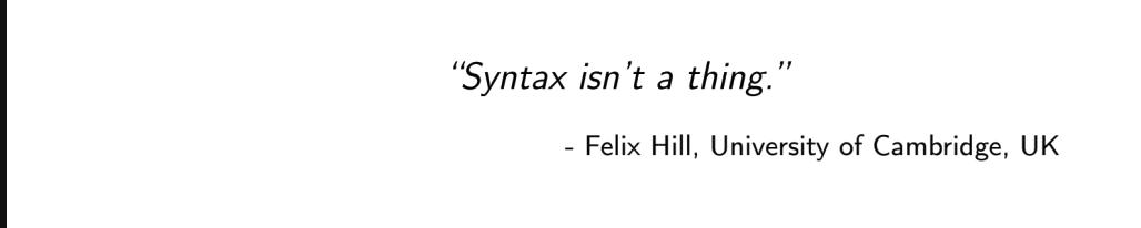 Felix Hill 用一种极为自信的语气对我说:“Kyunghyun,语法不是问题。”(顺便提一句,他可能是我听过非韩国人对我名字发音最准确的人。)我立即觉得 Felix 会成为我最好的朋友之一(事实证明他确实是),而这句话在接下来的几年里也成为我演讲 Slides 中常出现的一页。