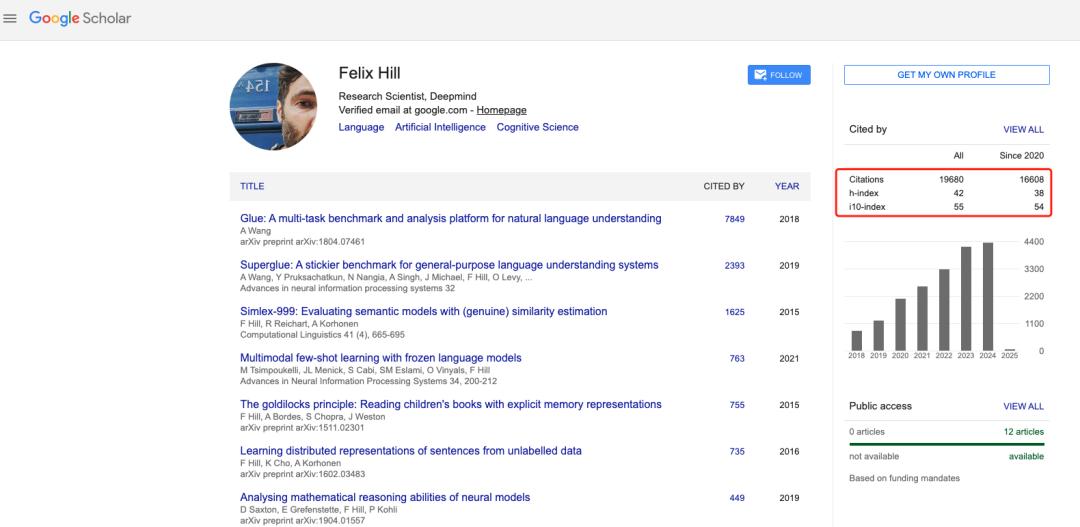 Felix Hill 是一位在自然语言处理和人工智能领域备受尊敬的研究科学家,学术研究成果颇丰。仅从学术搜索引擎 Google Scholar 来看,他的文献总引用量高达 19680 次,自 2020 年以来的引用量达到 16608 次,参与创作以及贡献的论文多达有 85 篇。