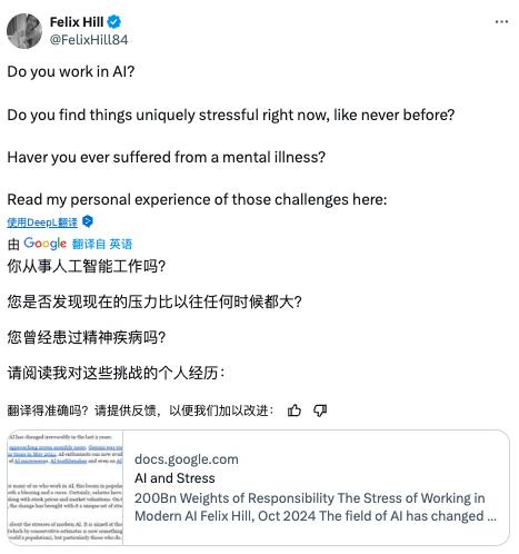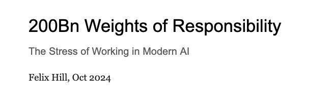 然而,在此之前,Felix Hill 长期饱受精神疾病困扰,这段痛苦的经历也深深影响了他的学术生涯和个人生活。在他于 2024 年 10 月发表的一篇主题为《2000 亿权重的责任》(https://docs.google.com/document/d/1aEdTE-B6CSPPeUWYD-IgNVQVZM25f7MF-u9qn5KJJvo/edit)文章中,他讲述了自己在现代 AI 工作中所承受的巨大压力以及身体状况,还在 X 上发出三连问: