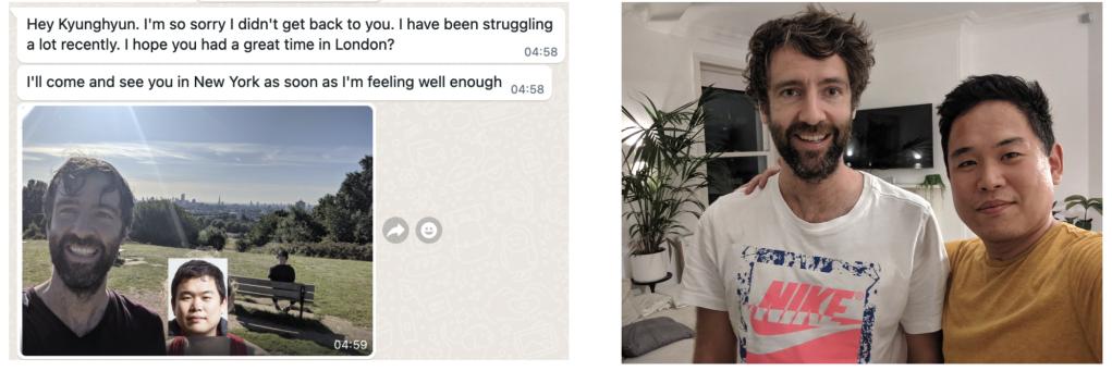 今年六月(2024年),在许多年之后,我终于有机会到访伦敦。我发消息问 Felix 是否愿意一起吃午饭。虽然我知道他可能很难答应,但我真的非常、非常希望能再次见到他,和他聊天、一起消磨时光。我们上一次见面还是在疫情之前,自那以后,我们只有零星的 Zoom 通话。我也暗暗希望能惊喜地看到他的健康状况有所好转。几个月后(2024 年 8 月),Felix 回复了,他为回复晚了道歉,这完全是没有必要的。他还发来了一张我们俩的合影(是的,这张照片并非由 AI 生成,而是由费利克斯拍摄的),提醒我们双方上一次在伦敦相聚的情景。