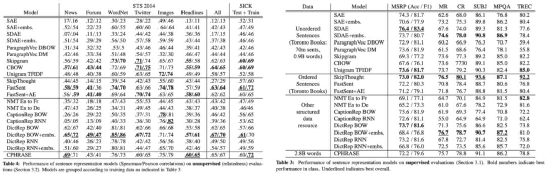 开发了 FastSent 和 Sequential Denoising Auto-Encoders,用于从未标注文本中学习句子表示;