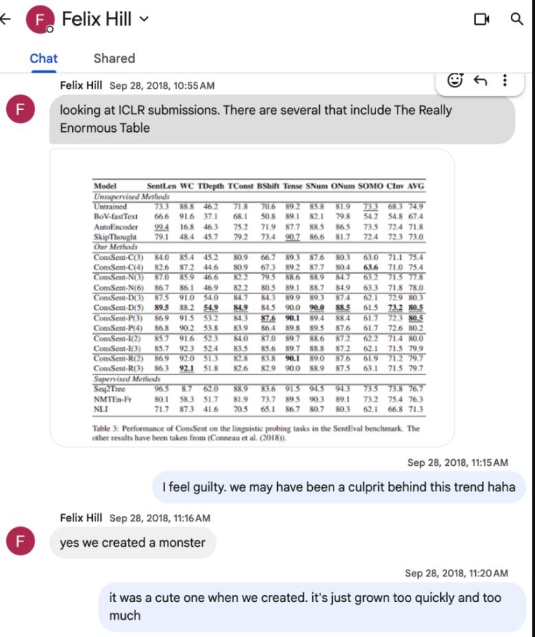 2018 年初,Felix 注意到在 ICLR 论文集中出现了几篇文章,其中包含了“The Really Enormous Table”。对此,我们只能责怪自己。即使是在严肃的研究中,我们也忍不住一起寻找乐趣。