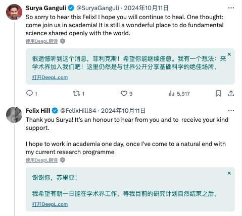 彼时斯坦福大学应用物理学、计算机科学系、电子工程系和神经生物学系副教授 Surya Ganguli 抛出橄榄枝:“很遗憾听到这个消息,Felix!希望你能继续痊愈。我有一个想法:来学术界加入我们吧!这里仍然是与世界公开分享基础科学的绝佳场所。”