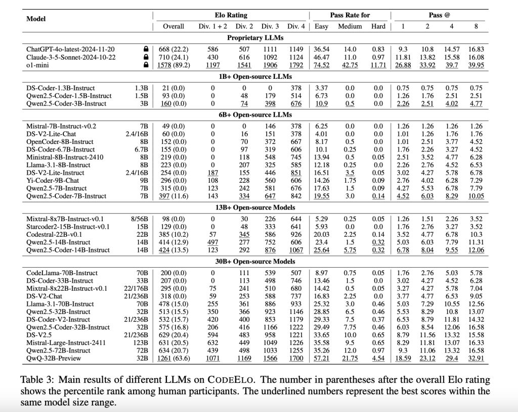 在对 30 个开源 LLM 和 3 个专有 LLM 进行测试后,OpenAI 的 o1-mini 模型表现最佳,Elo 评分为 1578,超过了 90% 的人类参与者;开源模型中,QwQ-32B-Preview 以 1261 分位居榜首。