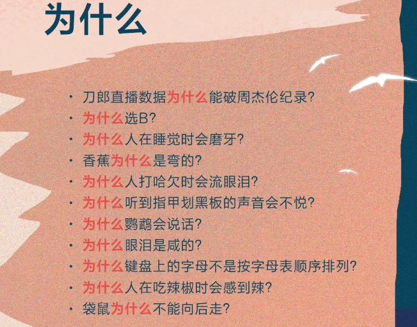 香蕉为什么是弯的?为什么听到指甲划黑板的声音会不悦?袋鼠为什么不能向后走?……乍一看,这些具体的问题或许没有多大的意义,但“为什么”这三个字,有很大意义。它的背后,是一个人对生活的敏锐观察,更是一个人对世界的探索冲动。