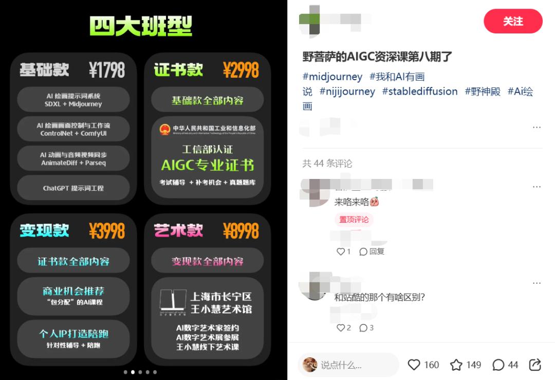 AI付费课里最热门的,要属以AI绘画、视频创作为主的AI工具应用类课程。这类课程主要面向渴望提升工作技能和发展副业的年轻人,课程价格大多在千元以上,也是被吐槽“割韭菜”的重灾区。